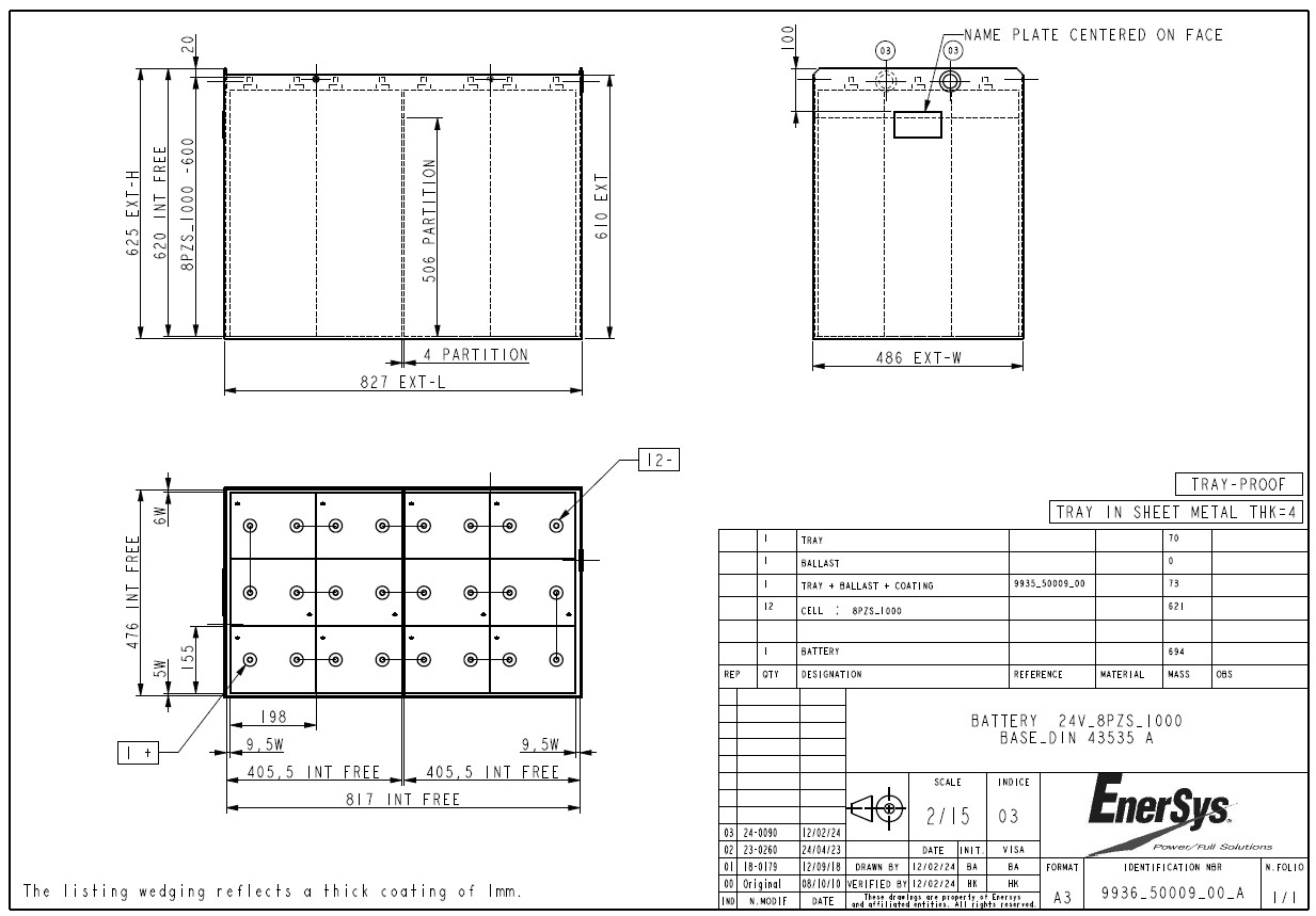 La batterie Fiamm EnerSys 8PZS1000 24V 1000Ah est conçue pour alimenter les chariots élévateurs électriques et autres engins de manutention nécessitant une forte capacité énergétique. Grâce à sa technologie plomb-acide de traction, elle offre une alimentation fiable, une excellente endurance et une grande robustesse pour les utilisations intensives en environnement industriel. Les dimensions du bac indiquées sur le plan technique sont de 827 mm de longueur, 486 mm de largeur et 625 mm de hauteur, avec un poids batterie de 694 kg et une plage de poids minimum/maximum de 642 à 710 kg. Cette batterie de chariot élévateur 24V 1000Ah est particulièrement adaptée aux professionnels qui recherchent une batterie de traction haute capacité, capable de soutenir des cycles de travail prolongés, de limiter les temps d’arrêt et d’optimiser la productivité de leur flotte de manutention. Son format 8PZS1000 en fait une solution idéale pour le remplacement d’une batterie de chariot élévateur usée ou pour l’équipement d’un matériel de manutention électrique exigeant.